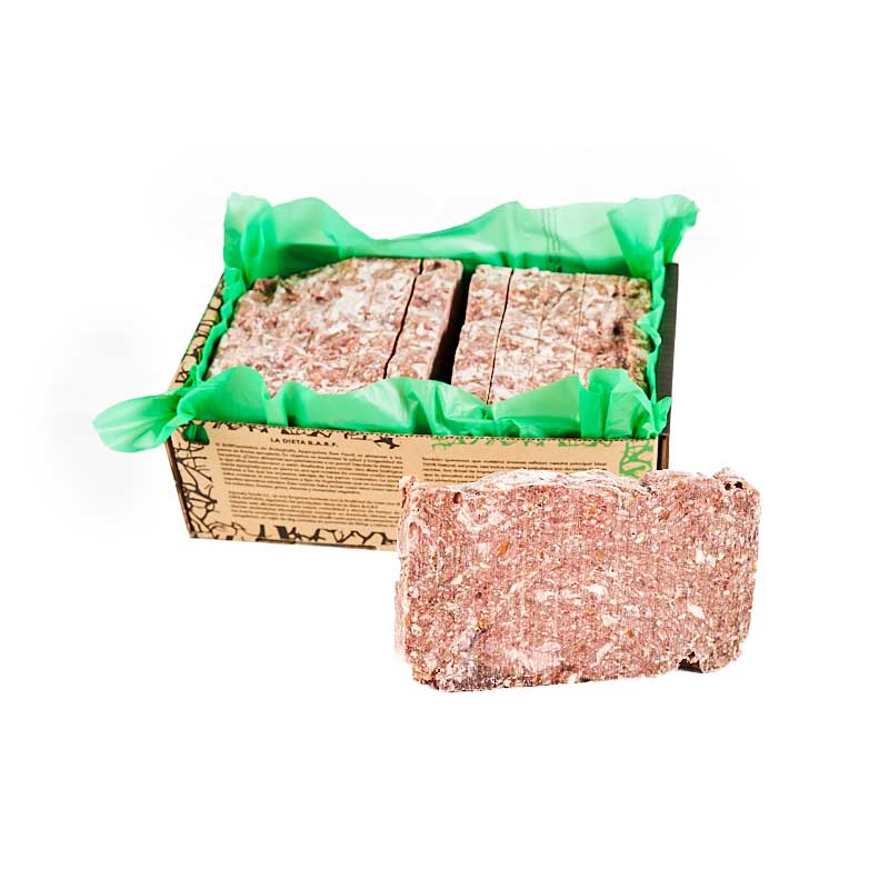 Carne de cordero (recorte de magro de cordero y corazón): 30%, vísceras de cordero (hígado y pulmón): 10%, hueso triturado de cordero (pecho de cordero): 10%, carne de pollo (carcasa de pollo 20%, recorte de muslo 8,5%): 28,5%, vísceras de pollo (hígado y corazón): 3%, calabaza/calabacín: 10%, manzana/pera: 6%, judía verde: 1,5%, zanahoria: 1%.