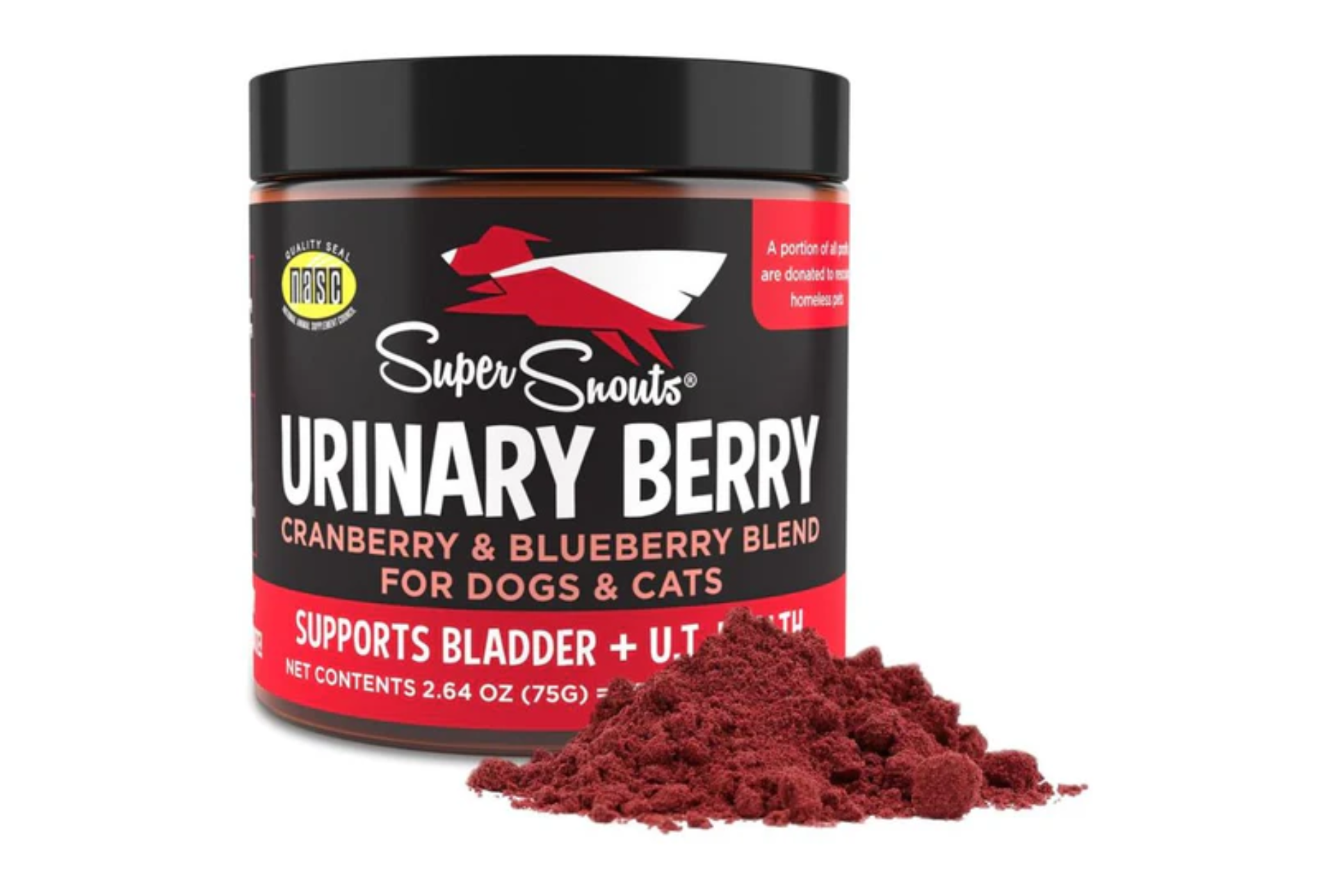 Super Snouts Urinary Berry es un suplemento natural de 75g que apoya la salud urinaria y el sistema inmunológico en perros y gatos. Con arándano rojo y azul, previene infecciones y fortalece las defensas de manera segura y efectiva